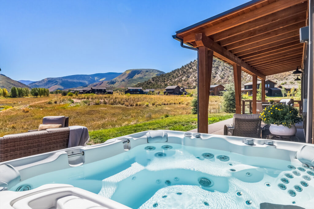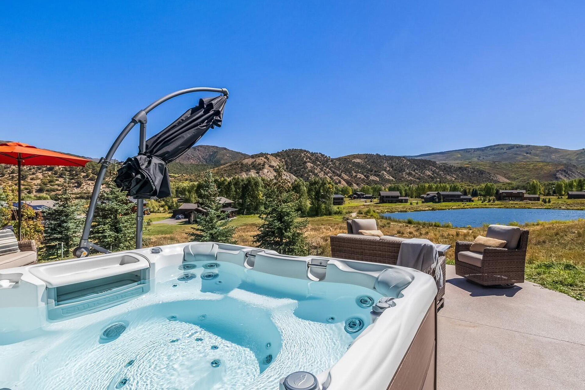 Expanded Outdoor Patio from Great Room and Master Bedroom accessing above ground Hot Tub with Additional Landscaping.
